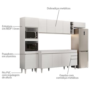 Conteúdo da Embalagem: 1 Balcão 180cm, 1 Armário Aéreo 160cm, 1 Nicho Riad, 1 Armários Aéreos 70cm, 1 Paneleiro.
