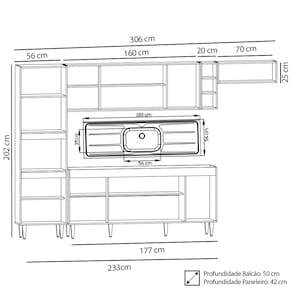 Conteúdo da Embalagem: 1 Balcão 180cm, 1 Armário Aéreo 160cm, 1 Nicho Riad, 1 Armários Aéreos 70cm, 1 Paneleiro, 1 Pia Inox 180cm.
