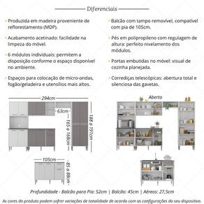 Cozinha - Altura: 188 a 191cm | Largura: 294cm | Profundidade: 45cm (Balcão) - 27,5cm (Aéreo)