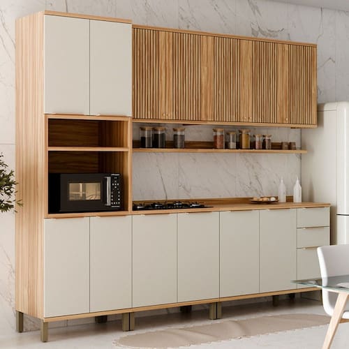 O(a) Armário de Cozinha Modulada com Balcão e Tampo 13 Portas 3 Gavetas Nice Fresado com Prateleira 100% Mdf Amêndoa/Off White - Pnr Móveis é produzido em 100% MDF na escala de brilho Semi-Brilho, e possui um grau de dificuldade de montagem: Médio.