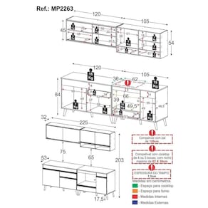 Dimensões do Produto Montado - Altura: 203cm | Largura: 225cm | Profundidade: 53cm (Balcão) - 32cm (Aéreo)