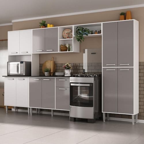 O conjunto conta com espaços dedicados para colocação de micro-ondas (até 9kg), utensílios mais altos e fogão ou geladeira. Os puxadores em ABS com acabamento cromado e os pés em polipropileno com regulagem de altura proporcionam estilo e um perfeito nivelamento aos módulos. O balcão possui tampo removível (devido à profundidade, apenas com pia sob medida), trazendo praticidade nas rotinas diárias. As portas e a gaveta são embutidas no móvel, oferecendo um visual de cozinha planejada.