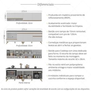 O balcão com tampo (15mm) recortável é com Cooktop de 4 ou 5 bocas e possui nicho para acomodar o seu forno, otimizando o espaço da cozinha. O recorte do tampo deve ser feito no momento da montagem, conforme o tamanho do seu Cooktop (tamanho máximo do nicho: 62 x 36cm). A cozinha também inclui balcão com tampo removível, com pia de 120cm. Cooktop e pia não inclusos.