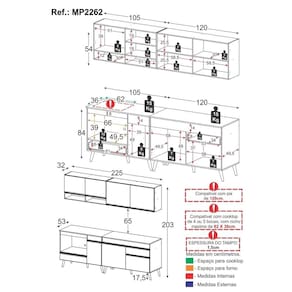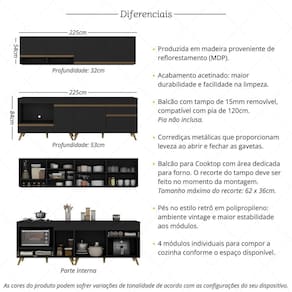 Dimensões do Produto Montado - Altura: 203cm | Largura: 225cm | Profundidade: 53cm (Balcão) - 32cm (Aéreo)