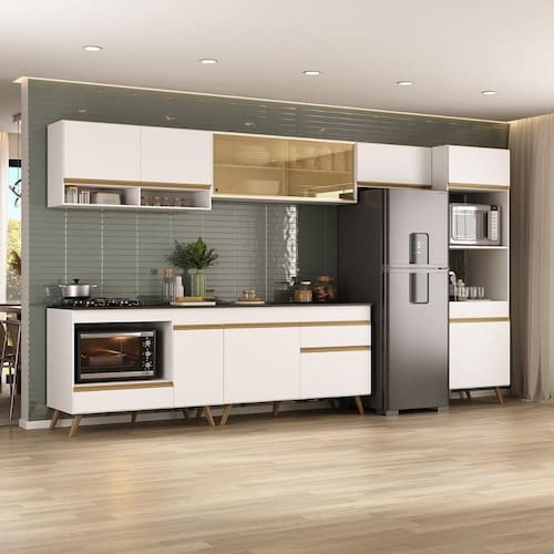 São 10 portas, sendo 2 basculantes com pistão a gás e 2 de correr em vidro reflecta, proporcionando máxima e praticidade no manuseio. As 2 gavetas com corrediças metálicas oferecem uma abertura suave. Ainda, o conjunto conta com espaço para micro-ondas, utensílios mais altos e nichos versáteis para colocação de temperos, proporcionando um amplo espaço de armazenamento.