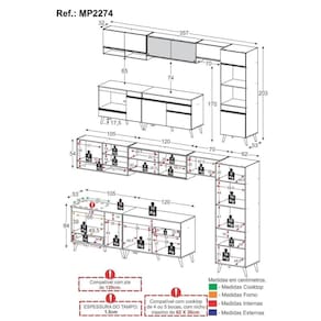 Dimensões do Produto Montado - Altura: 203cm | Largura: 357cm | Profundidade: 53cm (Balcão) - 32cm (Aéreo)