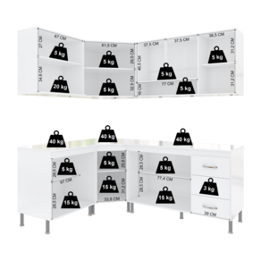 Itens inclusos: - Aéreo (120cm) – 3 portas (1 de vidro) - Aéreo de Canto (75cm) - 2 portas - Armário (70cm) - 2 portas, com espaço para forno/micro-ondas sendo (Altura: 34,5cm x Largura: 67cm x Profundidade: 36cm) - Balcão (120cm) – 3 portas, 3 gavetas e tampo removível - Balcão de Canto (75cm) - 1 porta - Balcão (70cm)- 2 portas e tampo