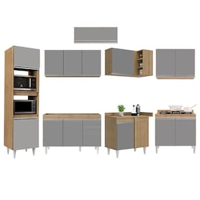 A começar pelo Paneleiro que conta com espaço para micro-ondas e forno elétrico, além de 2 portas para guardar seus utensílios. Na parte inferior você vai contar com 3 Balcões, o Balcão para Pia de 120cm sem tampo é versátil e pode ser personalizado com pia de inox ou granito, de acordo com a sua preferência, o Balcão 80cm com tampo possui 2 Portas e o Balcão de Canto com tampo auxilia na otimização do espaço para aproveitar todos os cantos do ambiente! Já na parte superior, você vai dispor de 4 Armários aéreos, Armário de Geladeira 70cm com porta basculante é prático e funcional, Armário 120cm que conta com 3 portas, Armário 80cm com 2 portas e Armário de Canto com 1 Porta e nichos.