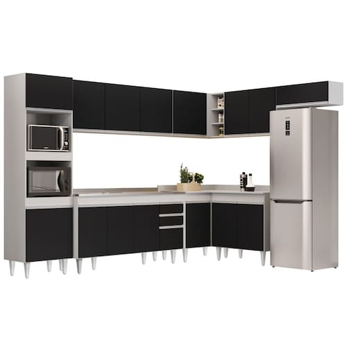 Praticidade, organização e beleza são as palavras que definem o Armário de Cozinha Modulada de Canto 8 Peças CP03 com Pia Inox Branco/Preto, da Lumil, confira os detalhes!