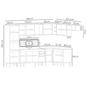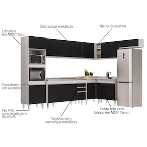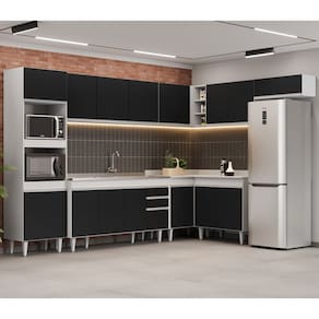A começar pelo Paneleiro que conta com espaço para micro-ondas e forno elétrico, além de 2 portas para guardar seus utensílios. Na parte inferior você vai contar com 3 Balcões, o Balcão Gabinete 120cm com Pia Inox que possui espelho traseiro concretado e é resistente e fácil de limpar, o Balcão 80cm com tampo 2 Portas e o Balcão de Canto com tampo auxiliam na otimização do espaço para aproveitar todos os cantos do ambiente! Já na parte superior, você vai dispor de 4 Armários aéreos, Armário de Geladeira 70cm com porta basculante é prático e funcional, Armário 120cm com 3 portas, Armário 80cm com 2 portas e Armário de Canto com 1 Porta e nichos.