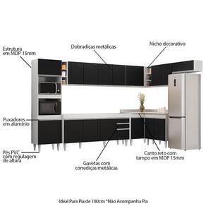 Conteúdo da Embalagem: 1 Balcão 180cm, 1 Armário Aéreo 160cm, 1 Armário Aéreo 70cm, 1 Armário Aéreo 80cm, 1 Balcão 80cm, 1 Nicho, 1 Balcão de canto, 1 Armário Aéreo de Canto, 1 Paneleiro.