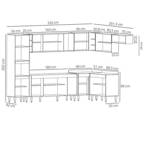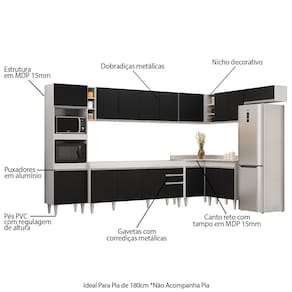 Conteúdo da Embalagem: 1 Balcão 180cm, 1 Armário Aéreo 160cm, 1 Armário Aéreo 70cm, 1 Armário Aéreo 80cm, 1 Balcão 80cm, 1 Nicho, 1 Balcão de canto, 1 Armário Aéreo de Canto, 1 Paneleiro.