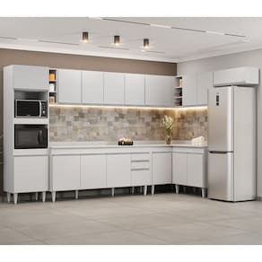 Conteúdo da Embalagem: 1 Balcão 180cm, 1 Tampo 180cm, 1 Armário Aéreo 160cm, 1 Armário Aéreo 70cm, 1 Armário Aéreo 80cm, 1 Balcão 80cm, 1 Nicho, 1 Balcão de canto, 1 Armário Aéreo de Canto, 1 Paneleiro.