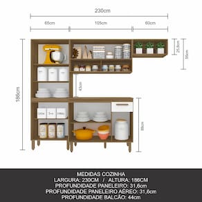 O Armário Cozinha Tieli 4 peças é um lançamento pensado para proporcionar funcionalidade e beleza para agregar a sua cozinha! Medida do Produto Montado: A: 186CM | L: 230CM