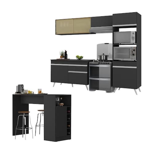 Armário De Cozinha Modulado Com Bancada Americana Multimóveis Mp2209 Preto/branco Preto/branco O Armário de Cozinha Modulado com Bancada Americana Multimóveis MP2209 é produzido em MDP com acabamento acetinado, oferecendo durabilidade e alta qualidade, com cerca 20% de brilho para um toque sofisticado. Com 2 portas de dobradiças, 2 portas de correr em vidro reflecta, 3 portas basculantes e módulo para forno e micro-ondas, a cozinha proporciona amplo espaço de armazenamento. Além disso, conta com espaço para colocação de fogão ou geladeira, deixando sua cozinha ainda mais completa. A gaveta com corrediças metálicas garante leveza no manuseio e permite acomodar utensílios menores. Os pés retrô em polipropileno e os puxadores em ABS adicionam charme ao design. Os tampos do balcão (suporta até 15kg) e da bancada (suporta até 20kg), ambos de 15mm, garantem resistência. Os módulos são individuais, permitindo a montagem de acordo com a disposição do ambiente. Versátil, o balcão possui tampo removível (compatível com pia de 120cm) e compartimento especial para utensílios mais altos. A bancada inclusa neste belo conjunto conta com 1 porta, prateleira interna e adega embutida, permitindo acomodar bebidas e itens mais utilizados no dia a dia, além de poder ser utilizada como divisora de ambientes. Conteúdo da Embalagem: 1 (um) Armário Aéreo 70cm 1 (um) Armário Aéreo com Portas de Vidro 120cm 1 (um) Balcão com Tampo 120cm 1 (um) Armário para Forno e Micro-Ondas 62cm 1 (uma) Bancada/Mesa Manual de Montagem Kit Ferragem