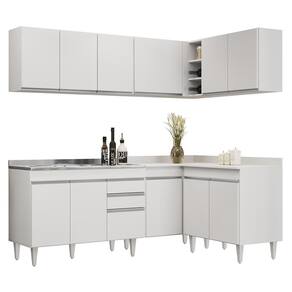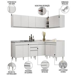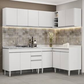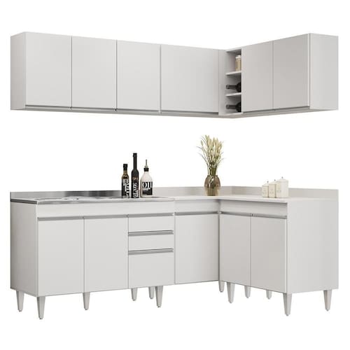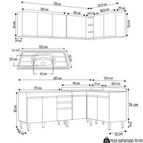 Conteúdo da Embalagem: 1 Balcão 120cm, 1 Armário Aéreo 120cm, 1 Armário Aéreo 80cm, 1 Balcão 80cm, 1 Balcão de canto, 1 Armário Aéreo de Canto, 1 Pia Inox 120cm.