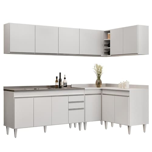 Além de ser composto por peças essenciais, como balcão para pia 150cm, armários aéreos, balcão de canto e balcão 2 portas, esse jogo de cozinha completo ainda conta com uma maior resistência contra riscos e umidade, garantindo sua durabilidade por muito tempo, graças ao acabamento em BP. Já os pés ajustáveis permitem você nivelar o móvel em qualquer tipo de piso. Para completar, o design contemporâneo dessa cozinha de canto se adapta facilmente a qualquer estilo de decoração, ao passo que a configuração de canto otimiza a circulação no ambiente.