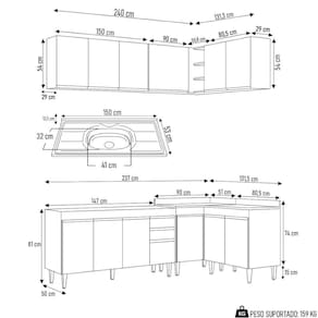 Conteúdo da Embalagem: 1 Balcão 150cm, 1 Armário Aéreo 150cm, 1 Armário Aéreo 80cm, 1 Balcão 80cm, 1 Balcão de canto, 1 Armário Aéreo de Canto, 1 Pia Inox 150cm.