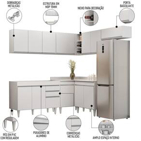 Conteúdo da Embalagem: 1 Balcão 120cm, 1 Armário Aéreo 120cm, 1 Armário Aéreo 70cm, 1 Armário Aéreo 80cm, 1 Balcão 80cm, 1 Balcão de canto, 1 Armário Aéreo de Canto.
