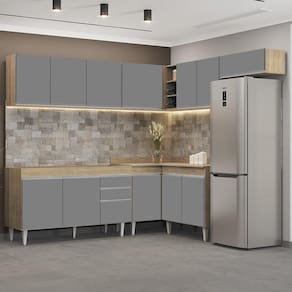 Além de ser composto por peças essenciais, como balcão para pia 150cm, armários aéreos, balcão de canto e balcão 2 portas, esse jogo de cozinha completo ainda conta com uma maior resistência contra riscos e umidade, garantindo sua durabilidade por muito tempo, graças ao acabamento em BP. Já os pés ajustáveis permitem você nivelar o móvel em qualquer tipo de piso. Para completar, o design contemporâneo dessa cozinha de canto se adapta facilmente a qualquer estilo de decoração, ao passo que a configuração de canto otimiza a circulação no ambiente.