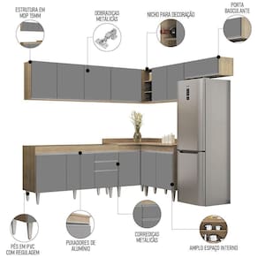 Conteúdo da Embalagem: 1 Balcão 150cm, 1 Armário Aéreo 150cm, 1 Armário Aéreo 70cm, 1 Armário Aéreo 80cm, 1 Balcão 80cm, 1 Balcão de canto, 1 Armário Aéreo de Canto.