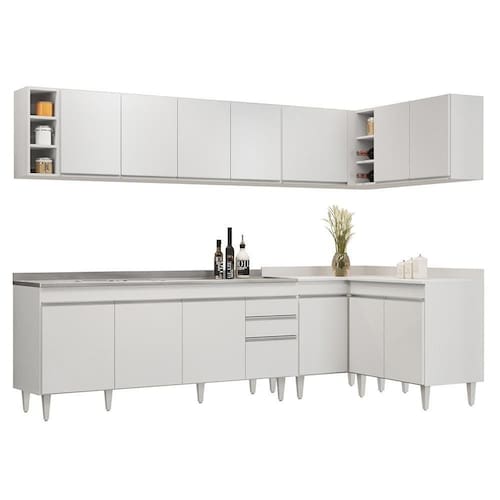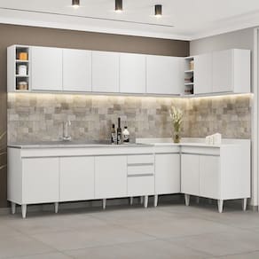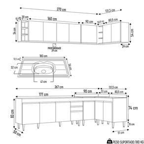 Conteúdo da Embalagem: 1 Balcão 180cm, 1 Armário Aéreo 160cm, 1 Armário Aéreo 80cm, 1 Balcão 80cm, 1 Balcão de canto, 1 Armário Aéreo de Canto, 1 Nicho, 1 Pia Inox 180cm.