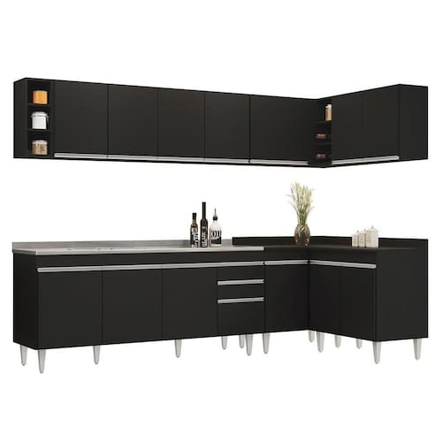 Renove a sua cozinha com o Armário de Cozinha Modulado de Canto 7 Peças CP36 com Pia Inox Preto, da Lumil, você terá tudo o que precisa ao seu alcance. Composto por 7 peças inteligentemente projetadas, esse armário modulado oferece uma interna perfeita para organizar todos os seus utensílios. Além de ser composto por peças essenciais, como balcão gabinete com pia, armários aéreos, balcão de canto com nicho garrafeiro e balcão 2 portas, esse jogo de cozinha completo ainda conta com uma maior resistência contra riscos e umidade, garantindo sua durabilidade por muito tempo, graças ao acabamento em BP. Já os pés ajustáveis permitem você nivelar o móvel em qualquer tipo de piso. Para finalizar, a pia inox completa a funcionalidade, enquanto o design contemporâneo dessa cozinha de canto harmoniza facilmente com qualquer estilo de decoração e otimiza a circulação no ambiente. Então, aproveite cada centímetro do seu espaço com esse armário de cozinha versátil e funcional. Invista em qualidade e praticidade para sua cozinha hoje mesmo! ESPECIFICAÇÕESDimensões do Produto: Largura: Superior: 270 x 131,3 cm/ Inferior: 267 x 131,5 cm. Altura: 202 cm. Profundidade: Superior: 29 cm / Inferior: 50 x 51 cm. Peso Total: 188 kg. Outras medidas: (Largura x Altura x Profundidade): Balcão Gabinete 180cm Dallas: 177 x 83 x 50 cm. Balcão 80cm Florida: 80,5 x 89 x 51 cm. Balcão de Canto Denver: 90 x 89 x 51 cm. Armário Aéreo 160cm Nevada: 160 x 54 x 29 cm. Armário Aéreo 80cm Califórnia: 80,5 x 54 x 29 cm. Armário Aéreo de Canto Austin: 90 x 54 x 50,8 cm. Nicho Riad: 20 x 54 x 27 cm. Pia Inox: 180 x 13,5 x 56 cm. Características do Produto: Material da Estrutura: MDP 15 mm. Material do fundo: MDF 3mm. Peso Suportado: 180 kg distribuídos. Acabamento: Melamina BP. Escala de brilho: Fosco. Possui Tampo: Sim. Possui Pia: Sim. Possui Portas: Sim. Material da Porta: MDP. Quantidade de Portas: 14 Portas. Tipo de dobradiças: Metálicas. Tipo de Porta: Convencional. Possui Gavetas: Sim. Material da Gaveta: MDP. Quantidade de Gavetas: 2 Gavetas. Tipo de corrediças: Metálicas. Possui Nichos: Sim. Quantidade de Nichos: 6 Nichos. Tipo de puxador: Alumínio. Possui Pés: Sim. Diferenciais: - Amplo espaço interno. - Puxadores em alumínio. - Design moderno. - Pés Reguláveis em PVC. - Balcão de canto e balcão 2 portas ambos com tampo. - Pia inox com traseiro concretado, cuba com rebaixe novitá, válvula e pino metálico. Sistema de Montagem: Parafusos e Cavilhas. Manual de Montagem: Sim. Complexidade da Montagem: Alta. Conteúdo da Embalagem: 1 Balcão 180cm, 1 Armário Aéreo 160cm, 1 Armário Aéreo 80cm, 1 Balcão 80cm, 1 Balcão de canto, 1 Armário Aéreo de Canto, 1 Nicho, 1 Pia Inox 180cm. Garantia do Fabricante: 90 dias contra de fabricação. Volumes: 9 Volumes. Montagem: Recomendamos que seja feita por um . Recomendação de Limpeza: Utilize pano levemente úmido. Observações importantes: - Produto para uso residencial em ambiente interno, não devendo ficar exposto diretamente ao sol, calor e umidades excessivas. - Pode haver alguma diferença de tonalidade entre a imagem e o produto real, por conta do tratamento de imagens e a calibração de cores do seu monitor. - As imagens são meramente ilustrativas, não acompanham objetos de decoração e eletrônicos. - Ao receber a mercadoria, o cliente deve verificar as condições da embalagem, caso haja alguma não assine o de . - Montagem, desmontagem e outras instalações serão de responsabilidade do cliente. Não nos responsabilizamos, no ato da , por subir escadas/elevadores ou pelo por guincho em apartamentos. Eventuais despesas são de responsabilidade do comprador. - Confira as dimensões do produto e certifique-se de que passará normalmente por supostos elevadores, portas, escadas e/ou corredores de sua residência.