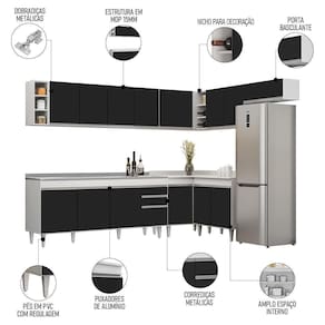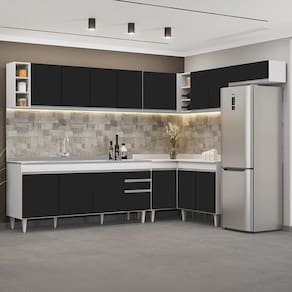 Renove a sua cozinha com o Armário de Cozinha Modulado de Canto 8 Peças CP27 com Pia Inox Branco/Preto, da Lumil, você terá tudo o que precisa ao seu alcance. Composto por 8 peças inteligentemente projetadas, esse armário modulado oferece uma interna perfeita para organizar todos os seus utensílios.