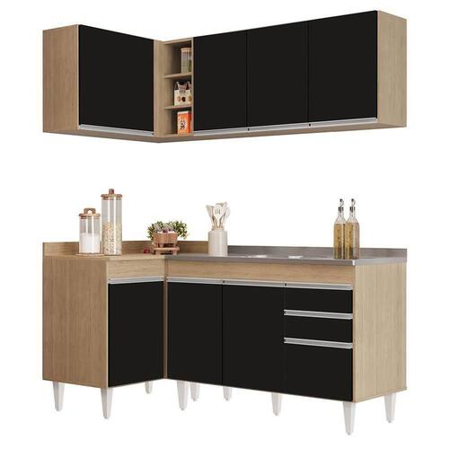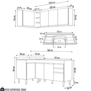 Conteúdo da Embalagem: 1 Balcão 120cm, 1 Armário Aéreo 120cm, 1 Balcão de Canto, 1 Armário Aéreo de Canto, 1 Pia Inox 120cm.