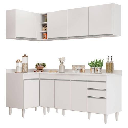 Procura uma cozinha prática e funcional?! Então, acaba de encontrar. Com o Armário de Cozinha Modulado de Canto Direito 4 Peças CP41 Balcão com Tampo Branco, da Lumil, você terá tudo o que precisa ao seu alcance. Composto por 4 peças inteligentemente projetadas, esse armário modulado oferece uma distribuição interna perfeita para organizar todos os seus utensílios. Além de ser composto por peças essenciais, como balcão para pia 150cm, balcão de canto e armários aéreos, esse jogo de cozinha ainda conta com uma maior resistência contra riscos e umidade, garantindo sua durabilidade por muito tempo, graças ao acabamento em BP. Já os pés ajustáveis permitem você nivelar o móvel em qualquer tipo de piso. Para completar, o design contemporâneo dessa cozinha de canto se adapta facilmente a qualquer estilo de decoração, ao passo que essa configuração otimiza a circulação no ambiente. Bom demais, não é mesmo?! Então, aproveite cada centímetro do seu espaço com esse armário de cozinha versátil e funcional. Invista em qualidade e praticidade para sua cozinha hoje mesmo! ESPECIFICAÇÕESDimensões do Produto: Largura: : 200,8 x 90 cm. Altura: 202 cm. Profundidade: Superior: 29 cm / Inferior: 51 cm. Peso Total: 130 kg. **NÃO ACOMPANHA PIA INOX. Outras medidas: (Largura x Altura x Profundidade): Balcão Gabinete 150cm Marrocos: 147 x 81 x 50 cm. Balcão de Canto Denver: 90 x 89 x 51 cm. Armário Aéreo 150cm Argélia: 150 x 54 x 29 cm. Armário Aéreo de Canto Austin: 90 x 54 x 50,8 cm. Tampo para Balcão Gabinete: 150 x 8,5 x 50,5 cm. Características do Produto: Material da Estrutura: MDP 15 mm. Material do fundo: MDF 3mm. Peso Suportado: 114 kg distribuídos. Acabamento: Melamina BP. Escala de brilho: Fosco. Possui Tampo: Sim. Possui Pia: Não. Possui Portas: Sim. Material da Porta: MDP. Quantidade de Portas: 9 Portas. Tipo de dobradiças: Metálicas. Tipo de Porta: Convencional. Possui Gavetas: Sim. Material da Gaveta: MDP. Quantidade de Gavetas: 2 Gavetas. Tipo de corrediças: Metálicas. Possui Nichos: Sim. Quantidade de Nichos: 3 Nichos. Tipo de puxador: Alumínio. Possui Pés: Sim. Diferenciais: - Amplo espaço interno. - Puxadores em alumínio. - Design moderno. - Montagem canto direito. - Pés Reguláveis em PVC. - Ambos balcões acompanham tampo. Sistema de Montagem: Parafusos e Cavilhas. Manual de Montagem: Sim. Complexidade da Montagem: Alta. Conteúdo da Embalagem: 1 Balcão 150cm, 1 Armário Aéreo 150cm, 1 Balcão de canto, 1 Armário Aéreo de Canto, 1 Tampo 150cm. Garantia do Fabricante: 90 dias contra defeitos de fabricação. Volumes: 5 Volumes. Montagem: Recomendamos que seja feita por um . Recomendação de Limpeza: Utilize pano levemente úmido. Observações importantes: - Produto para uso residencial em ambiente interno, não devendo ficar exposto diretamente ao sol, calor e umidades excessivas. - Pode haver alguma diferença de tonalidade entre a imagem e o produto real, por conta do tratamento de imagens e a calibração de cores do seu monitor. - As imagens são meramente ilustrativas, não acompanham objetos de decoração e eletrônicos. - Ao receber a mercadoria, o cliente deve verificar as condições da embalagem, caso haja alguma dano não assine o comprovante de recebimento. - Montagem, desmontagem e outras instalações serão de responsabilidade do cliente. Não nos responsabilizamos, no ato da entrega, por subir escadas/elevadores ou pelo transporte por guincho em apartamentos. Eventuais despesas são de responsabilidade do comprador. - Confira as dimensões do produto e certifique-se de que passará normalmente por supostos elevadores, portas, escadas e/ou corredores de sua residência.