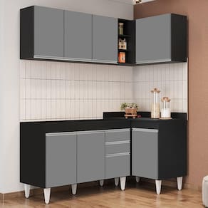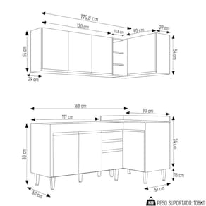 Conteúdo da Embalagem: 1 Balcão 120cm, 1 Armário Aéreo 120cm, 1 Balcão de Canto, 1 Armário Aéreo de Canto.