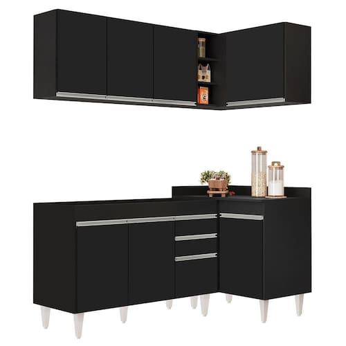 Prático, compacto e funcional, com o Armário de Cozinha Modulado de Canto Esquerdo 4 Peças CP46 Balcão sem Tampo Preto, da Lumil, você terá tudo o que precisa ao seu alcance, uma vez que esse armário modulado oferece uma interna perfeita para organizar todos os seus utensílios, pois é composto por 4 peças escolhidas minuciosamente, com balcão para pia, balcão de canto, e dois armários aéreos, sendo um de canto com nicho.