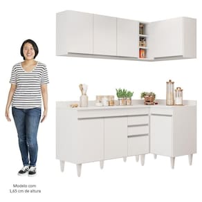 Prático, compacto e funcional, com o Armário de Cozinha Modulado de Canto Esquerdo 4 Peças CP47 Balcão com Tampo Branco, da Lumil, você terá tudo o que precisa ao seu alcance, uma vez que esse armário modulado oferece uma interna perfeita para organizar todos os seus utensílios, pois é composto por 4 peças escolhidas minuciosamente, com balcão gabinete com tampo, balcão de canto, e dois armários aéreos, sendo um de canto com nicho. Além disso, o acabamento BP confere a esse jogo de cozinha completo uma maior resistência contra riscos e umidade, garantindo sua durabilidade por muito tempo. Já os pés ajustáveis permitem que você nivelar o móvel em qualquer tipo de piso. Para completar, o design contemporâneo dessa cozinha de canto se adapta facilmente a qualquer estilo de decoração, ao passo que a configuração de canto otimiza a circulação no ambiente. Então, aproveite cada centímetro do seu espaço com esse armário de cozinha versátil e funcional. Invista em qualidade e praticidade para sua cozinha hoje mesmo! ESPECIFICAÇÕESDimensões do Produto: Largura: 170,8 x 90 cm. Altura: 202 cm. Profundidade: Superior: 29 cm / Inferior: 51 cm. Peso Total: 114 kg. **NÃO ACOMPANHA PIA INOX. Outras medidas: (Largura x Altura x Profundidade): Balcão Gabinete 120cm Michigan: 117 x 83 x 50 cm. Balcão de Canto Denver: 90 x 89 x 51 cm. Armário Aéreo 120cm Virgínia: 120 x 54 x 29 cm. Armário Aéreo de Canto Austin: 90 x 54 x 50,8 cm. Tampo para Balcão Gabinete: 120 x 8,5 x 50,5 cm. Características do Produto: Material da Estrutura: MDP 15 mm. Material do fundo: MDF 3mm. Peso Suportado: 108 kg distribuídos. Acabamento: Melamina BP. Escala de brilho: Fosco. Possui Tampo: Sim. Possui Pia: Não. Possui Portas: Sim. Material da Porta: MDP. Quantidade de Portas: 8 Portas. Tipo de dobradiças: Metálicas. Tipo de Porta: Convencional. Possui Gavetas: Sim. Material da Gaveta: MDP. Quantidade de Gavetas: 2 Gavetas. Tipo de corrediças: Metálicas. Possui Nichos: Sim. Quantidade de Nichos: 3 Nichos. Tipo de puxador: Alumínio. Possui Pés: Sim. Diferenciais: - Amplo espaço interno. - Puxadores em alumínio. - Design moderno. - Pés Reguláveis em PVC. - Ambos os balcões acompanham tampo. - Montagem Canto Esquerdo. Sistema de Montagem: Parafusos e Cavilhas. Manual de Montagem: Sim. Complexidade da Montagem: Alta. Conteúdo da Embalagem: 1 Balcão 120cm, 1 Armário Aéreo 120cm, 1 Balcão de Canto, 1 Armário Aéreo de Canto, 1 Tampo 120cm. Garantia do Fabricante: 90 dias contra defeitos de fabricação. Volumes: 5 Volumes. Montagem: Recomendamos que seja feita por um . Recomendação de Limpeza: Utilize pano levemente úmido. Observações importantes: - Produto para uso residencial em ambiente interno, não devendo ficar exposto diretamente ao sol, calor e umidades excessivas. - Pode haver alguma diferença de tonalidade entre a imagem e o produto real, por conta do tratamento de imagens e a calibração de cores do seu monitor. - As imagens são meramente ilustrativas, não acompanham objetos de decoração e eletrônicos. - Ao receber a mercadoria, o cliente deve verificar as condições da embalagem, caso haja alguma não assine o de . - Montagem, desmontagem e outras instalações serão de responsabilidade do cliente. Não nos responsabilizamos, no ato da , por subir escadas/elevadores ou pelo por guincho em apartamentos. Eventuais despesas são de responsabilidade do comprador. - Confira as dimensões do produto e certifique-se de que passará normalmente por supostos elevadores, portas, escadas e/ou corredores de sua residência.