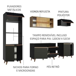 Para completar, ambos os balcões acompanham tampos. O do balcão maior pode ser removido para colocação de pia de inox ou pedra com espaço de 120 x 52 cm. O tampo do balcão menor pode ser recortado para instalação de cooktop.