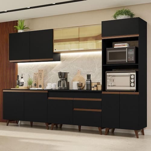 Todos os módulos são avulsos, fabricados com materiais de padrão superior, como corrediças e dobradiças metálicas. Os puxadores são embutidos, em alumínio na coloração marrom e os pés em madeira são muito bonitos e conferem firmeza e resistência ao móvel.
