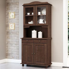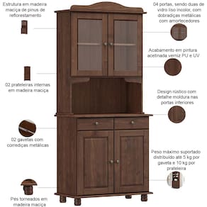 Fabricado em madeira maciça de alta resistência, esse armário de 4 portas (sendo 2 com vidro estilo cristaleira) e 2 gavetas práticas oferece o equilíbrio ideal entre armazenamento e exibição decorativa. Os pés torneados e os puxadores em tonalidade envelhecida mantêm o charme vintage característico, enquanto as portas de vidro permitem mostrar suas peças favoritas - como conjuntos de xícaras ou geleias artesanais. Embora seja uma versão de armário de cozinha compacto, não economiza nas qualidades; afinal, conta com estrutura robusta, cristaleira integrada e armazenamento inteligente. Demais, não é mesmo?!