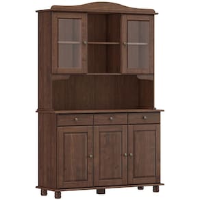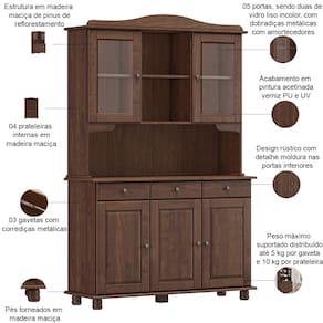 Fabricado em madeira maciça de alta resistência, esse armário de 5 portas (incluindo 2 portas com vidro estilo cristaleira) e 3 gavetas espaçosas é a solução perfeita para quem deseja praticidade sem perder o aconchego das cozinhas de sítio, chácaras ou casas de campo. Os pés torneados e os puxadores em tonalidade envelhecida conferem um ar vintage, enquanto as portas de vidro permitem exibir suas peças favoritas - como louças especiais ou coleções de vidros - com todo charme. Em outras palavras, essa combinação perfeita entre armário e cristaleira oferece armazenamento amplo, exposição elegante e durabilidade garantida.