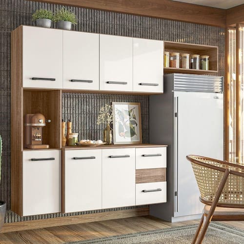 Armario de Cozinha suspenso 7 portas e 2 gavetas Juliete Nicioli A cozinha e o coracao da casa. Entao, nada mais justo que ter um espaco dinamico e organizado de modo a facilitar a rotina. Pensando nisso, a Nicioli criou a Cozinha Suspensa Juliete. Vem com a gente conferir como esse movel pode te ajudar!Nao importa se voce tem uma cozinha pequena, pois por ser um modelo de cozinha suspensa ela e perfeita para a otimizacao do espaco de circulacao e ainda facilita na hora da limpeza. Alem disso, possui otima divisao interna, o que contribui para dispor cada objeto em seu devido lugar. Sem contar que voce podera apostar em itens decorativos sobre o balcao com tampo ou ate mesmo deixar os eletrodomesticos a vista. Ai, vai do seu gosto e imaginacao.Nao perca tempo, tenha dias mais faceis com a Cozinha Compacta Suspensa Juliete. Medidas da Cozinha Juliete:Altura: 136 cmLargura: 180 cmProfundidade: 29 cm Caracteristicas:Medidas Internas (L x A x P)Balcao: 58 x 45,5 x 33 cmNicho Geladeira: 57,5 x 21 x 29 cmMaterial da Estrutura: MDP07 portas02 gavetas com corredicas metalicas02 NichosDesign suspenso.Amplo espaco interno.Limpeza com pano macio e levemente umedecido, nao utilizar material aspero. Nao utilizar solventes a base e de inflamaveis.Produto necessita montagem. Nao nos responsabilizamos pela montagem incorreta do produto.A garantia do produto e fornecida pelo fabricante durante 3 meses contra defeito de fabricacao. Mau uso ou montagem incorreta NAO estao inclusos.