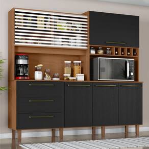 Estrutura: MDP, com espessura de 15 mmAcabamento: Em pintura U.V, resistentePorta: Sim, 05 portas, sendo 01 porta superior basculante com pistão a gás, 02 portas com vidros temperados com serigrafia personalizada e com dobradiças metálicasGaveta: Sim, 03 gavetas com corrediças metálicas e travamento no fundo e sendo 01 gaveta com divisões para talheresPrateleira: Sim, 7 prateleirasNicho: Sim, adega para 4 garrafas e um nicho para temperosPuxadores: Sim, em PVCPés: Sim, sendo 8 pés em PVC com regulagem de alturaDiferencial: Espaço para micro-ondas e design eleganteDimensões do produto montado