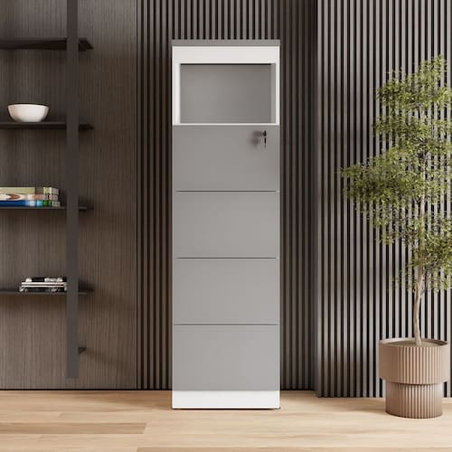 Altura: 160 cm Acabamento da Gaveta: BP Acabamento dos Pés: Pintura Ambiente Principal: Escritório Armário Suspenso: Não codigo_ean: 7900288257086 Complexidade da Montagem: Média: pode ser montado por mais de uma pessoa e/ou necessite de maior conhecimento para montagem Cor: Cinza Sagrado / Branco Cor do Produto: Cinza Sagrado / Branco Cor Flex: Não Cor Interna: Branco Escala de Brilho: Fosco Espessura do Tampo: 25 mm Formato do Armário: Retangular Gaveta com Chave: 01 Itens Inclusos: 1 Armário, Kit Ferragens e Manual da Montagem. Linha ou Coleção: Corporate Localização do Nicho: Nicho em Cima Manual de Montagem e Instalação: https://product-hub-prd.madeiramadeira.com.br/320860948/documents/29633730-4fec-4af3-8b2b-482ae79bcd41326730165951760009622603.pdf Marca: F5 Office Material da Gaveta: MDP Material dos Pés: Metal Material Principal: MDP Montagem Flex: Não, o produto só pode ser montado conforme a imagem. Necessita Montagem: Sim Orientação do Armário: Vertical Origem do Produto: Nacional Pés Reguláveis: Sim Peso: 52 kg Peso Máximo por Gaveta: 15 kg Possui Espelho: Não Possui Mesa Retrátil: Não Possui Nicho: Sim Possui Pés: 04 Possui Portas: Não Possui Prateleiras: Não Quantidade de Armários: 1 Recomendações de Uso, Manutenção e Limpeza: Para uma limpeza mais efetiva, utilizar apenas pano macio e sabão neutro. Não utilizar produtos abrasivos. Sapatas Niveladoras: Sim Sistema de Montagem: Parafusos e buchas metálicas. Suporta Até (kg): 80 kg Tamanho do Armário: Alto (Acima de 150cm) Tipo de Armário: Totalmente Fechado Tipo de Corrediça da Gaveta: Metálica Telescópica Tipo de Puxador da Gaveta: Embutido Marca: Não Informado