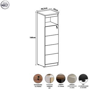 Altura: 160 cm Acabamento da Gaveta: BP Acabamento dos Pés: Pintura Ambiente Principal: Escritório Armário Suspenso: Não codigo_ean: 7900288257147 Complexidade da Montagem: Média: pode ser montado por mais de uma pessoa e/ou necessite de maior conhecimento para montagem Cor: Cinza Sagrado / Preto Cor do Produto: Cinza Sagrado / Preto Cor Flex: Não Cor Interna: Preto Escala de Brilho: Fosco Espessura do Tampo: 25 mm Formato do Armário: Retangular Gaveta com Chave: 01 Itens Inclusos: 1 Armário, Kit Ferragens e Manual da Montagem. Linha ou Coleção: Corporate Localização do Nicho: Nicho em Cima Manual de Montagem e Instalação: https://product-hub-prd.madeiramadeira.com.br/613026214/documents/a9146f6f-2cfc-4aa5-a047-068e6322d8dd326730165951760009622603.pdf Marca: F5 Office Material da Gaveta: MDP Material dos Pés: Metal Material Principal: MDP Montagem Flex: Não, o produto só pode ser montado conforme a imagem. Necessita Montagem: Sim Orientação do Armário: Vertical Origem do Produto: Nacional Pés Reguláveis: Sim Peso: 52 kg Peso Máximo por Gaveta: 15 kg Possui Espelho: Não Possui Mesa Retrátil: Não Possui Nicho: Sim Possui Pés: 04 Possui Portas: Não Possui Prateleiras: Não Quantidade de Armários: 1 Recomendações de Uso, Manutenção e Limpeza: Para uma limpeza mais efetiva, utilizar apenas pano macio e sabão neutro. Não utilizar produtos abrasivos. Sapatas Niveladoras: Sim Sistema de Montagem: Parafusos e buchas metálicas. Suporta Até (kg): 80 kg Tamanho do Armário: Alto (Acima de 150cm) Tipo de Armário: Totalmente Fechado Tipo de Corrediça da Gaveta: Metálica Telescópica Tipo de Puxador da Gaveta: Embutido Marca: Não Informado
