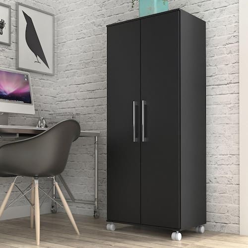 ARMARIO DE ESCRITORIO | Com 2 portas, prateleiras internas, dobradiças metálicas, puxadores cromados e rodízios faz do armário de escritório um móvel com design sofisticado, é própria para pessoas exigentes com organização, sendo feita em MDP de 15mm nas portas e MDP 12mm para prateleiras, laterais e tampos. Suporta pesos de até 8kg em suas prateleiras e 15kg no tampo suficiente para acomodar diversos materiais de escritório. Seu maior diferencial são os rodízios que facilitam a movimentação do produto para limpeza.