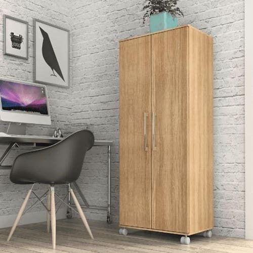 ARMARIO DE ESCRITORIO | Com 2 portas, prateleiras internas, dobradiças metálicas, puxadores cromados e rodízios faz do armário de escritório um móvel com design sofisticado, é própria para pessoas exigentes com organização, sendo feita em MDP de 15mm nas portas e MDP 12mm para prateleiras, laterais e tampos. Suporta pesos de até 8kg em suas prateleiras e 15kg no tampo suficiente para acomodar diversos materiais de escritório. Seu maior diferencial são os rodízios que facilitam a movimentação do produto para limpeza.