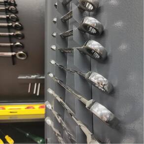 • Extras para Organização: Inclui porta brocas, suporte para chaves de boca e ganchos, oferecendo múltiplas opções para pendurar e organizar ferramentas.
