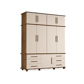 Esse Armário conta com um design clássico e simples, somando na decoração de seu quarto ou closet, com o espaço amplo para você se organizar. Ele conta 4 portas maiores, 6 gavetas, 2 prateleiras internas, varal para cabides, armário inferior com 1 porta e armário superior com 4 portas.