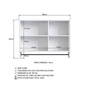 A espelheira ES8020 é produzida em MDP 15mm e acabamento em FF fosco. A estrutura do fundo é em MDF 3mm. Possui 1 porta de bater com espelho 3mm e dobradiça metálica ; prateleiras internas, 1 toalheiro metálico e 2 nichos. Necessita fixação na parede. Produto suporta até 10kgs. Conteúdo da embalagem: móvel, ferragens e manual de montagem. A fixação das peças e/ou acessórios é feita por parafusos e cavilhas. Para a limpeza do móvel utilizar pano levemente umedecido. Garantia de 03 meses contra defeitos de fabricação. Medidas do produto (AxLxP): 60x80x16cm. Peso do produto: 10,7kgs. Marca: Prodecor