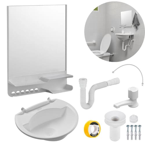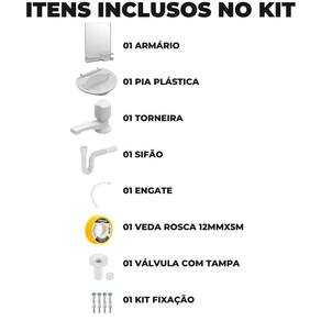 Armário Banheiro Espelheira Sobrepor 26,5x6,5x34,8cm Com um design moderno e traços retos, o armário otimiza o espaço do ambiente, organizando e armazenando com eficiência os objetos do dia a dia. Ele já vem montado, o que facilita a instalação, e pode ser instalado sobreposto à parede, proporcionando ainda mais praticidade. ESPECIFICAÇÕES TÉCNICAS Modo de Instalação: Sobrepor Material: Poliestireno Acabamento: Fosco Abertura da Porta: Lado Esquerdo ou Direito Quantidade de Portas: 0 Porta s Acompanha Espelho: Sim Espelho Interno: Não Quantidade de Prateleiras: 1 Prateleiras Tipo de Material: Plástico Cor: Branco do Fabricante: 90 dias Manual: Sim Dimensões: 26,5 x 6,5 x 34,8 cm Pia Lavatório Banheiro Plástico 8L Branca A pia plástica para banheiro da marca Astra é uma opção prática e funcional para instalação em ambientes com espaços reduzidos. Com dimensões compactas e design simples, é fabricada em polipropileno de alta qualidade, o que garante sua resistência e durabilidade. ESPECIFICAÇÕES TÉCNICAS Material: Polipropileno Dimensões: 50 x 18,3 x 40cm Possui Porta Sabonete: Sim Possui Furo Para Torneira: Não Capacidade: 8L Locais Sugeridos: Banheiros e Lavabos Acabamento: Brilhante Cor: Branca Formato: Oval do Fabricante: 90 dias Torneira Para Lavatório Plástica Branca A torneira para lavatório possui o volante anatômico, que facilita a abertura e o fechamento, o plástico ABS com proteção UV, e a durabilidade e a qualidade sempre presente nos produtos. ESPECIFICAÇÕES TÉCNICAS Composição: Plástico de engenharia ABS , Polipropileno PP e elastômeros Utilização: Água fria Fabricação: Nacional Sifão Sanfonado Universal 73cm Branco O sifão sanfonado universal é um acessório essencial de encanamento, projetado para se adaptar a qualquer saída de válvula de pia e a qualquer tubulação de esgoto, independentemente de seu tamanho ou tipo. Além disso, o sifão sanfonado corrige possíveis desalinhamentos entre a cuba e a tubulação de despejo, evitando assim a formação de bloqueios e obstruções que possam causar vazamentos ou refluxo de água suja. Esse acessório é ideal para tanques, pias e cubas em banheiros, cozinhas e lavanderias. ESPECIFICAÇÕES TÉCNICAS Material: Polipropileno Entrada Para Válvula Polegada : 7/8 Saída Para Tubos e Conexões: 38, 40, 48 e 50mm Modelo: Para pias, cubas, tanques, lavatórios e válvula americana Suporta temperatura até: 90 graus Cor: Branco Acabamento: Brilhante Manual de Instalação: Sim ITENS INCLUSOS 01 Armário 01 Pia Plástica 01 Suporte 01 Válvula Com tampa 03 Buchas S10 06 Buchas S6 03 Parafusos 3,5 x 55mm 02 Parafusos 3,5 x 30mm 04 Parafusos 3 x 30mm 05 Arruelas 01 Torneira Plástica 01 Sifão 01 Rolo de Fita Veda Rosca 12mm x 5m 01 Engate Flexível 40cm x 1/2