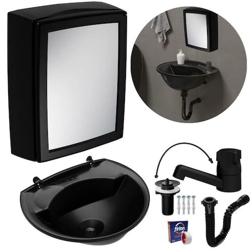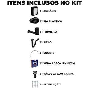 Armário espelheira + pia lavatório 4l + torneira preta + sifão universal sanfonado + engate flexível + fita veda rosca Armário banheiro espelhiera sobrepor 30x11x37cm 01 porta astra Com um design moderno e traços retos, o armário otimiza o espaço do ambiente, organizando e armazenando com eficiência os objetos do dia a dia. Ele já vem montado, o que facilita a instalação, e pode ser instalado sobreposto à parede, proporcionando ainda mais praticidade. Esse armário também possui uma ampla superfície de espelho, que aumenta a funcionalidade do produto, permitindo que os usuários se arrumem com mais comodidade e praticidade. Além disso, sua divisão interna com porta-escovas e prateleiras embutidas oferece espaço suficiente para armazenar itens de higiene pessoal, remédios, maquiagens e outros produtos do dia a dia. Especificações técnicas Modo de instalação: sobrepor Material: poliestireno Acabamento: brilhante Abertura da porta: ambos os lados Quantidade de portas: 1 porta s Acompanha espelho: sim Espelho interno: não Quantidade de prateleiras: 2 prateleiras Tipo de material: plástico Cor: preto do fabricante: 90 dias Manual: sim Dimensões: 30 x 10,8 x 36,9cm Pia lavatorio banheiro plástico 4l preto astra A pia plástica para banheiro da marca astra é uma opção prática e funcional para instalação em ambientes com espaços reduzidos. Com dimensões compactas e design simples, é fabricada em polipropileno de alta qualidade, o que garante sua resistência e durabilidade. Com capacidade de armazenamento de 4 litros, essa pia é indicada para uso em banheiros e lavabos, sendo uma solução ideal para quem busca uma alternativa econômica e de fácil instalação. Além disso, sua superfície lisa facilita a limpeza e manutenção, permitindo que ela se mantenha higiênica e livre de germes e bactérias. Especificações técnicas Material: polipropileno Dimensões: 35,5 x 28 x 15,8cm Possui porta sabonete: sim Possui furo para torneira: não Capacidade: 4,0l Locais sugeridos: banheiros e lavabos Acabamento: brilhante Marca: astra Cor: preto Formato: oval do fabricante: 90 dias Torneira para lavatório plástica preta japi A torneira para lavatório possui o volante anatômico, que facilita a abertura e o fechamento, o plástico abs com proteção uv, e a durabilidade e a qualidade sempre presente nos produtos da japi. Especificações técnicas Composição: plástico de engenharia abs , polipropileno pp e elastômeros Utilização: água fria Fabricação: nacional Sifão sanfonado universal 61cm preto astra O sifão sanfonado universal astra é um acessório essencial de encanamento, projetado para se adaptar a qualquer saída de válvula de pia e a qualquer tubulação de esgoto, independentemente de seu tamanho ou tipo. Além disso, o sifão sanfonado universal astra corrige possíveis desalinhamentos entre a cuba e a tubulação de despejo, evitando assim a formação de bloqueios e obstruções que possam causar vazamentos ou refluxo de água suja. Especificações técnicas Material: polipropileno Entrada para válvula polegada : 7/8 Saída para tubos e conexões: 38, 40, 48 e 50mm Modelo: para pias, cubas, tanques, lavatórios e válvula americana Suporta temperatura até: 90 graus Cor: preto Acabamento: brilhante do fabricante: 90 dias O kit segue com todos os itens para montagem e pronto para uso após a instalação A se aplica a todo e qualquer vício ou defeito aparente ou que não estejam em conformidade com o produto. - 90 dias para o armário - 90 dias para a pia plástica - 30 dias para a torneira - 90 dias para o sifão - 90 dias para o engate Itens inclusos 01 armário 04 buchas s6 04 parafusos 3 x 30mm 01 pia plástica 01 torneira 01 sifão 01 engate 01 rolo de fita veda rosca 12mm x 5m 01 suporte 01 válvula com tampa 04 buchas s8 02 parafusos 3,5 x 30mm 06 arruelas