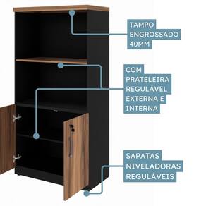do ar e/ ou dos substratos inicia a sua reticulação, tornando-se um adesivo Acabamento da Porta: BP Acabamento da Prateleira: BP Ambiente Principal: Escritório Complexidade da Montagem: Média: pode ser montado por mais de uma pessoa e/ou necessite de maior conhecimento para montagem Cor: Marrom/Preto Cor do Produto: Marrom/Preto Escala de Brilho: Fosco Escala de Brilho da Porta: Fosco Escala de Brilho da Prateleira: Fosco Espessura do Tampo: 40 mm Itens Inclusos: Um armário estante Manual de Montagem e Instalação: https://product-hub-prd.madeiramadeira.com.br/909413/documents/bc6998f6-2dc6-4028-862a-6977a7ba05d91971768159817162276618415.pdf Material da Porta: MDP Material da Prateleira: MDP Material Principal: MDP Necessita Montagem: Sim Origem do Produto: Nacional Peso: 48,8 kg Peso Máximo por Prateleira: 15 kg Possui Espelho: Não Possui Nicho: Sim Possui Pés: Não Possui Portas: 02 Possui Prateleiras: 03 Recomendações de Uso, Manutenção e Limpeza: Antes de limpar recomenda-se que seja retirada toda a poeira com um espanador ou flanela seca para evitar riscos na superfície, após utilize um pano umido em água, macio e limpo. Sapatas Niveladoras: Sim Sistema de Montagem: Parafusos e Cavilhas. Suporta Até (kg): 75 kg Tipo de Dobradiça/Corrediça da Porta: Metálica Tipo de Puxador da Porta: Externo