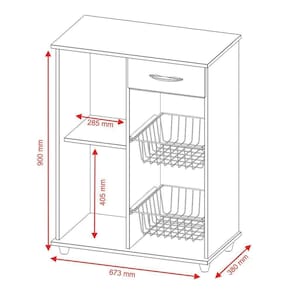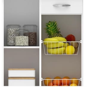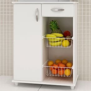 A Fruteira Belize Notável é um móvel multiuso que vai deixar sua cozinha mais prática e funcional. Com superfície para colocar bebedouro, forno ou micro-ondas, essa fruteira de madeira é composta por 01 porta com dobradiça metálica, capaz de garantir mais suavidade ao movimento de abrir e fechar a porta. Tem uma prateleira interna que é bem dividida e permite organizar os utensílios como desejar. A fruteira balcão possui 01 gaveta com corrediça metálica, que traz maior leveza ao movimento, sem contar que nessa gaveta você ainda pode guardar objetos menores, que precisam estar sempre à mão quando necessário. A fruteira multiuso tem os puxadores em PVC cromado, que além de alta qualidade é um modelo clássico que nunca sai de moda. Tem também 02 cestos aramados que são ótimos para armazenar frutas e legumes de forma mais fácil. Essa fruteira para cozinha Belize Notável possui sua estrutura em madeira MDP que é extremamente resistente a umidade, evitando o empenamento. Já a pintura U.V. com acabamento em brilho, além de proteger o móvel quanto a exposição da luz, oferece maior durabilidade da cor. O balcão de cozinha para fruteira vem com os pés redondos e reforçados, com capacidade para suportar até 33 kg e ainda possibilitam facilidade na movimentação e limpeza do seu ambiente. Tudo isso faz desse armário para micro-ondas com fruteira o produto ideal para manter sua cozinha mais organizada e com um design moderno. Cor: Branco Cor: Branco
